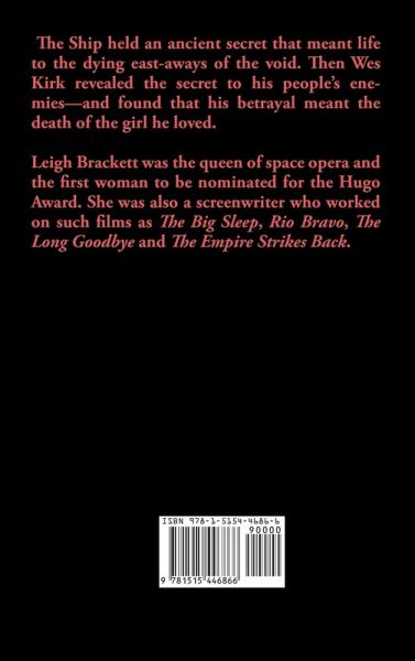 The Ship held an ancient secret that meant life to the dying east-aways of the void. Then Wes Kirk revealed the secret to his people’s enemies—and found that his betrayal meant the death of the girl he loved. Leigh Brackett was the queen of space opera and the first woman to be nominated for the Hugo Award. She was also a screenwriter who worked on such films as The Big Sleep, Rio Bravo, The Long Goodbye and The Empire Strikes Back.