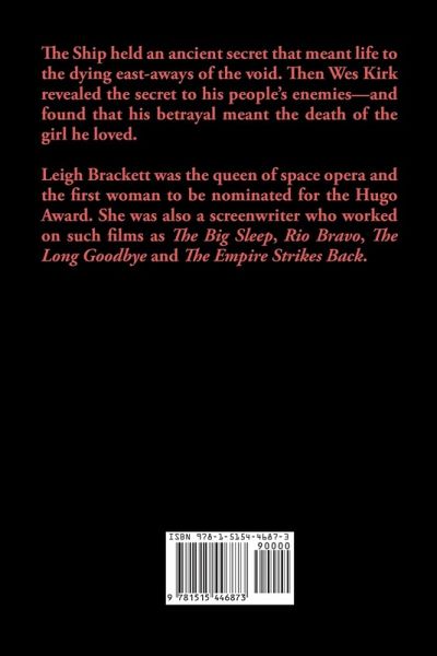 The Ship held an ancient secret that meant life to the dying east-aways of the void. Then Wes Kirk revealed the secret to his people’s enemies—and found that his betrayal meant the death of the girl he loved. Leigh Brackett was the queen of space opera and the first woman to be nominated for the Hugo Award. She was also a screenwriter who worked on such films as The Big Sleep, Rio Bravo, The Long Goodbye, and The Empire Strikes Back.