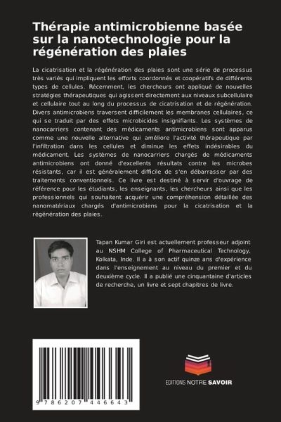 La cicatrisation et la régénération des plaies sont une série de processus très variés qui impliquent les efforts coordonnés et coopératifs de différents types de cellules. Récemment, les chercheurs ont appliqué de nouvelles stratégies thérapeutiques qui agissent directement aux niveaux subcellulaire et cellulaire tout au long du processus de cicatrisation et de régénération. Divers antimicrobiens traversent difficilement les membranes cellulaires, ce qui se traduit par des effets microbicides insignifiants. Les systèmes de nanocarriers contenant des médicaments antimicrobiens sont apparus comme une nouvelle alternative qui améliore l'activité thérapeutique par l'infiltration dans les cellules et diminue les effets indésirables du médicament. Les systèmes de nanocarriers chargés de médicaments antimicrobiens ont donné d'excellents résultats contre les microbes résistants, car il est généralement difficile de s'en débarrasser par des traitements conventionnels. Ce livre est destiné à servir d'ouvrage de référence pour les étudiants, les enseignants, les chercheurs ainsi que les professionnels qui souhaitent acquérir une compréhension détaillée des nanomatériaux chargés d'antimicrobiens pour la cicatrisation et la régénération des plaies.
