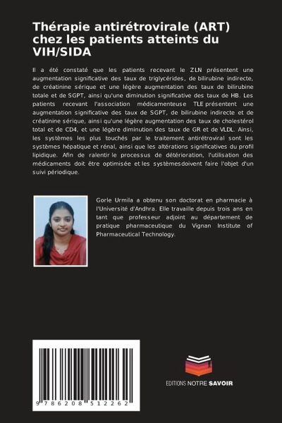 Il a été constaté que les patients recevant le ZLN présentent une augmentation significative des taux de triglycérides, de bilirubine indirecte, de créatinine sérique et une légère augmentation des taux de bilirubine totale et de SGPT, ainsi qu'une diminution significative des taux de HB. Les patients recevant l'association médicamenteuse TLE présentent une augmentation significative des taux de SGPT, de bilirubine indirecte et de créatinine sérique, ainsi qu'une légère augmentation des taux de cholestérol total et de CD4, et une légère diminution des taux de GR et de VLDL. Ainsi, les systèmes les plus touchés par le traitement antirétroviral sont les systèmes hépatique et rénal, ainsi que les altérations significatives du profil lipidique. Afin de ralentir le processus de détérioration, l'utilisation des médicaments doit être optimisée et les systèmesdoivent faire l'objet d'un suivi périodique.