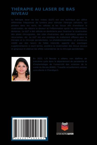 La thérapie laser de bas niveau (LLLT) est une technique qui utilise différentes fréquences de lumière pour stimuler l'énergie cellulaire, qui pénètre dans les nerfs, les cellules et les tissus afin d'améliorer la cicatrisation, de réduire la douleur et l'inflammation après les interventions dentaires. La LLLT a été utilisée en dentisterie pour favoriser la cicatrisation des plaies chirurgicales, des sites d'extraction, des ulcérations aphteuses récurrentes, etc. La LLLT est une stratégie de traitement efficace pour la thérapie et la chirurgie parodontales. La photobiomodulation, un processus médié par des lasers de faible intensité, apporte des avantages supplémentaires à court terme, accélère la cicatrisation des tissus osseux et gingivaux et atténue les effets secondaires de la chirurgie parodontale.