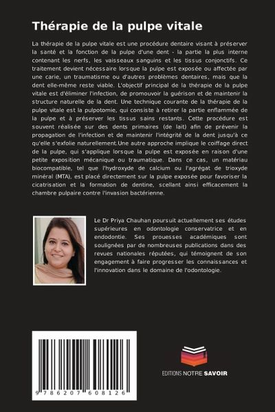 La thérapie de la pulpe vitale est une procédure dentaire visant à préserver la santé et la fonction de la pulpe d'une dent - la partie la plus interne contenant les nerfs, les vaisseaux sanguins et les tissus conjonctifs. Ce traitement devient nécessaire lorsque la pulpe est exposée ou affectée par une carie, un traumatisme ou d'autres problèmes dentaires, mais que la dent elle-même reste viable. L'objectif principal de la thérapie de la pulpe vitale est d'éliminer l'infection, de promouvoir la guérison et de maintenir la structure naturelle de la dent. Une technique courante de la thérapie de la pulpe vitale est la pulpotomie, qui consiste à retirer la partie enflammée de la pulpe et à préserver les tissus sains restants. Cette procédure est souvent réalisée sur des dents primaires (de lait) afin de prévenir la propagation de l'infection et de maintenir l'intégrité de la dent jusqu'à ce qu'elle s'exfolie naturellement.Une autre approche implique le coiffage direct de la pulpe, qui s'applique lorsque la pulpe est exposée en raison d'une petite exposition mécanique ou traumatique. Dans ce cas, un matériau biocompatible, tel que l'hydroxyde de calcium ou l'agrégat de trioxyde minéral (MTA), est placé directement sur la pulpe exposée pour favoriser la cicatrisation et la formation de dentine, scellant ainsi efficacement la chambre pulpaire contre l'invasion bactérienne.
