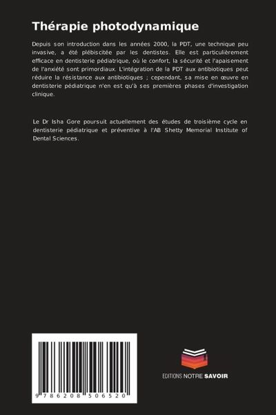 Depuis son introduction dans les années 2000, la PDT, une technique peu invasive, a été plébiscitée par les dentistes. Elle est particulièrement efficace en dentisterie pédiatrique, où le confort, la sécurité et l'apaisement de l'anxiété sont primordiaux. L'intégration de la PDT aux antibiotiques peut réduire la résistance aux antibiotiques ; cependant, sa mise en oeuvre en dentisterie pédiatrique n'en est qu'à ses premières phases d'investigation clinique.