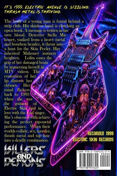 It's 1999. Electric Avenue is sizzling. Thrash metal is thriving. The body of a young man is found behind a strip club. His skinless hand is clutching an open book. A message is written in his own blood. Detective Stella Mahoney, yanked from a heavy metal and bourbon bender, is thrust into a hunt for the Skin Peeler. Her inherited Mahoney instincts heighten. Lolita eases the grip of her damaged brain by immersing herself in MTV videos. The contortion of her lip distorts her rhymes. Her mind flickers back to 1993 when she was the guitarist of Electric Skin and in love with the lead singer. She's obsessed with achieving the perfect performance. When their worlds collide, sex, murder, thrash metal and rap fuse into a deadly combination. A deep mind dive into the consciousness of both the serial killer and the detective. A complete fusion of music and storytelling. Can be read out of order of the previous books in the series. Custom thrash metal soundtrack available on Bandcamp (Killers and Demons).