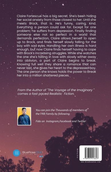 Claire Fortescue has a big secret. She's been hiding her social anxiety from those closest to her. Until she meets Brock, that is. He's funny, caring, kind. Everything a person could ask for. Except for one problem; he suffers from depression. Finally finding someone else not so perfect in a world that demands perfection, Claire allows herself to open up to Brock, and finds herself slowly falling for the boy with sad eyes. Handling her own illness is hard enough, but now Claire finds herself having to cope with Brock's increasing struggles. While she watches the one she's falling in love with slowly wither away into oblivion, a part of Claire begins to break. Knowing full well they share a romance that can never last, she gives her heart to the depressed boy. The one person she knows holds the power to break her into a million shattered pieces.
