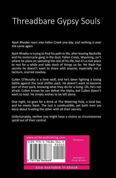 Nash Rhodes roars into Fallen Creek one day, and nothing is ever the same again. Nash Rhodes is trying to find his path in life, after leaving Nashville and his motorcycle gang in the dust. Fallen Creek, Wyoming, isn’t where he plans on spending the rest of his life, but it’s a nice place to rest for a while and take stock of things so far. Yet Nash has secrets he doesn’t want to share with anyone, especially not a taciturn, scarred cowboy. Cullen O’Murphy is a lone wolf, and he’s been fighting a losing battle against the local shifter pack. He doesn’t want to become part of their pack, knowing what they do for a living. Oh, he’s not afraid. Cullen knows he can defeat the Alpha, but Cullen doesn’t want to lead. He simply wishes to be left alone. One night, he goes for a drink at The Watering Hole, a local bar, and he meets Nash. The lust is combustible, yet both men are leery about trusting the other with all their secrets. Unfortunately, neither one might have a choice as circumstances spiral out of their control.