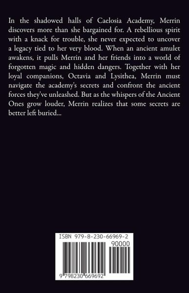 In the shadowed halls of Caelosia Academy, Merrin discovers more than she bargained for. A rebellious spirit with a knack for trouble, she never expected to uncover a legacy tied to her very blood. When an ancient amulet awakens, it pulls Merrin and her friends into a world of forgotten magic and hidden dangers. Together with her loyal companions, Octavia and Lysithea, Merrin must navigate the academy's secrets and confront the ancient forces they've unleashed. But as the whispers of the Ancient Ones grow louder, Merrin realizes that some secrets are better left buried...