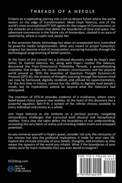 Embark on a captivating journey into a not-so-distant future where the world teeters on the edge of transformation. Meet Hope Valencia, one of the world's most accomplished PT-SOF agents for the League of Consciousness, as she embarks on a mission that defies the boundaries of time and space. Her adventure commences in the future city of Amsterdam, cloaked in an aura of uncertainty, where a cryptic task awaits her. In this uncertain future, technology has taken an unexpected turn, controlled by powerful media conglomerates. What was meant to propel humanity's progress has become a tool of manipulation, ensnaring humanity through the technological programming of belief systems. At the heart of this turmoil lies a profound discovery made by Hope's own father, Dr. Gabriel Valencia. He, along with Hope's mother Ella Valencia, discovered the Trans-Dimensional Probability Threads, a groundbreaking revelation that bridges the chasm between consciousness and the physical world around us. With the invention of Quantum Thought Dynamics-AI Protocol (QTD-AI), the streams of thoughts coursing through the human mind can now be harnessed, digitally rendered, and utilized for experimentation. For the first time in history, science has the ability to digitally read people's minds, but its implications extend far beyond what the Valencia's had anticipated. The invention of QTD-AI provides evidence of a multiverse, where every belief-based choice spawns new realities. At the heart of this discovery lies a powerful equation, B∈E+T=R, a symbol of the infinite choices available to every individual and society as a whole. Join Hope Valencia as she embarks on a perilous journey, navigating extraordinary challenges that transcend both physical and metaphysical realities. Every step she takes defies the boundaries of our understanding, unraveling the very fabric of reality and unveiling hidden truths and untapped potentials. As you immerse yourself in Hope's quest, consider not only the intricacies of her mission but also the profound implications it holds for your own life. Explore the intricate interplay of your beliefs, thoughts, and emotions as they weave the tapestry of the world you inhabit. What if the boundaries of your reality were far more malleable than you ever dared to imagine?