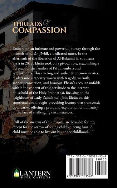Embark on a compelling journey with Ehsan Javidi, a nurse with an extraordinary mission. In the aftermath of the liberation of Al-Bukamal in southeast Syria in 2017, Ehsan takes on the formidable task of establishing a hospital to care for the families of ISIS members and sympathizers. This gripping real account unfolds a narrative that traverses tragedy, warmth, sadness, conviction, and humour, all within the context of true servitude to the inerrant household of the Holy Prophet (s), particularly the neighbours of Lady Zainab (sa). Join Ehsan on an emotional and thought-provoking journey that transcends boundaries and explores the profound essence of humanity in challenging circumstances. "All of the sorrows of this hospital are bearable for me, except for the sorrow of seeing children being hurt. A child must be able to live out his or her childhood..."