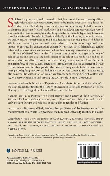 Considering silk as a major force of cross-cultural interaction, this book examines the integration of silk production and consumption into various cultures in the pre-modern world. Silk has long been a global commodity that, because of its exceptional qualities, high value and relative portability, came to be traded over very long distances. Similarly, the silk industry - from sericulture to the weaving of cloth - was one of the most important fields of production in the medieval and early modern world. The production and consumption of silks spread from China to Japan and Korea and travelled westward as far as India, Persia and theByzantine Empire, Europe, Africa and the Americas. As contributors to this book demonstrate, in this process of diffusion silk fostered technological innovation and allowed new forms of organization of labour to emerge. Its consumption constantly reshaped social hierarchies, gender roles, aesthetic and visual cultures, as well as rituals and representations of power. Threads of Global Desire is the first attempt at considering a global history of silk in the pre-modern era. The book examines the role of silk production and use in various cultures and its relation to everyday and regulatory practices. It considers silk as a major force of cross cultural interaction through technological exchange and trade in finished and semi-finished goods. Silks mediated design and a taste for luxuries and were part of gifting practices in diplomatic and private contexts. Silk manufacturing also fostered thecirculation of skilled craftsmen, connecting different centres and regions across continents and linking the countryside to urban production. DAGMAR SCHÄFER is Director of Department 3 'Artefacts, Action, and Knowledge'at the Max Planck Institute for the History of Science in Berlin and Professor h.c. of the History of Technology at the Technical University, Berlin. GIORGIO RIELLO is Professor of Global History and Culture at the University of Warwick. He has published extensively on the history of material culture and trade in early modern Europe and Asia and in particular on textiles and fashion. LUCA MOLA is Professor of Early Modern Europe: History of the Renaissance and the Mediterranean in a World Perspective at the European University Institute in Fiesole. Contributors: JOSÉ L. GASCH-TOMAS, SURAIYA FAROQHI, KAROLINA HUTKOVA, FUJITA KAYOKO, BEN MARSH, RUDOLPHMATTHEE, LESLEY ELLIS MILLER, DAVID MITCHELL, LUCA MOLA, LISA MONNAS, AMANDA PHILLIPS, GIORGIO RIELLO, DAGMAR SCHÄFER, ANGELA SHENG
