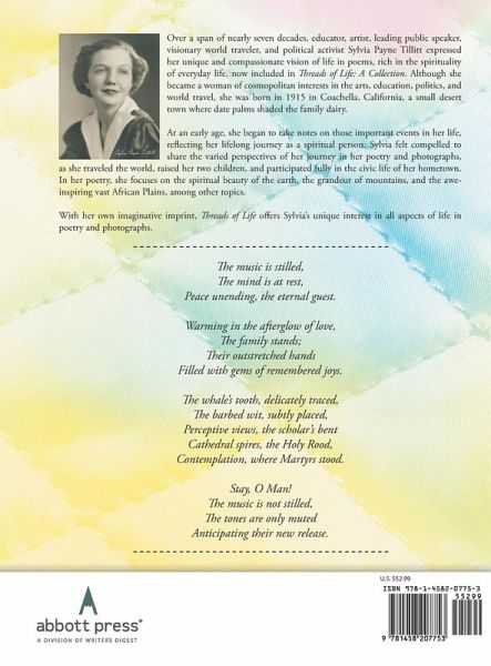 Over a span of nearly seven decades, educator, artist, leading public speaker, visionary world traveler, and political activist Sylvia Payne Tillitt expressed her unique and compassionate vision of life in poems, rich in the spirituality of everyday life, now included in Threads of Life: A Collection. Although she became a woman of cosmopolitan interests in the arts, education, politics, and world travel, she was born in 1915 in Coachella, California, a small desert town where date palms shaded the family dairy. At an early age, she began to take notes on those important events in her life, reflecting her lifelong journey as a spiritual person. Sylvia felt compelled to share the varied perspectives of her journey in her poetry and photographs, as she traveled the world, raised her two children, and participated fully in the civic life of her hometown. In her poetry, she focuses on the spiritual beauty of the earth, the grandeur of mountains, and the awe-inspiring vast African Plains, among other topics. With her own imaginative imprint, Threads of Life offers Sylvia's unique interest in all aspects of life in poetry and photographs. The music is stilled, The mind is at rest, Peace unending, the eternal guest. Warming in the afterglow of love, The family stands; Their outstretched hands Filled with gems of remembered joys. The whale's tooth, delicately traced, The barbed wit, subtly placed, Perceptive views, the scholar's bent Cathedral spires, the Holy Rood, Contemplation, where Martyrs stood. Stay, O Man! The music is not stilled, The tones are only muted Anticipating their new release.