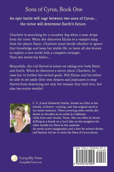 An epic battle will rage between two sons of Cyrus...the victor will determine Earth’s future. Charlotte is searching for a runaway dog when a man drops from the trees. His pull on her is more than physical—and might be dangerous. When she discovers Elyian is actually a vampire king from another planet, Charlotte has to decide whether to ignore her new-found knowledge to keep her stable life, or leave all she knows to explore a new world with a complete stranger. Then she meets his father… Elyian’s planet, Ranic, is in trouble. The evil Havvol is intent on killing Elyian and taking over both Ranic and Earth. When Havvol discovers a secret about Charlotte, she becomes his new obsession. Will Elyian and his father be able to set aside their own desires and jealousies to stop Havvol from destroying not only the woman they both love, but also two entire worlds?