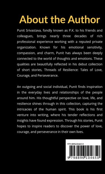"Threads of Resilience: Tales of Love, Courage, and Perseverance" Threads of Resilience by P.K. Srivastava weaves a compelling narrative tapestry that showcases the profound strength of the human spirit. Each story captures a unique journey of overcoming adversity through love, courage, and unwavering perseverance. These tales explore the depths of resilience in everyday life-how ordinary people face extraordinary challenges. From navigating complex relationships and moral dilemmas to confronting personal and societal obstacles, the characters embody the essence of resilience: not merely surviving but transforming adversity into strength and wisdom. Through his vivid storytelling, Srivastava brings to life characters that are both relatable and inspirational. They don't just endure; they evolve, learning to harness their inner strength in ways that celebrate human vulnerability and determination. This collection proves that resilience can foster growth and lead to profound, life-changing insights. Threads of Resilience is more than a collection of stories; it is an invitation to reflect on our own struggles and triumphs, encouraging us to find the courage and persistence necessary to thrive in the face of life's challenges. Embrace these stories and discover the resilience within us all, ready to transform hardship into opportunity for growth.