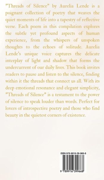 "Threads of Silence" by Aurelia Lende is a poignant collection of poetry that weaves the quiet moments of life into a tapestry of reflective verse. Each poem in this compilation explores the subtle yet profound aspects of human experience, from the whispers of unspoken thoughts to the echoes of solitude. Aurelia Lende's unique voice captures the delicate interplay of light and shadow that forms the undercurrent of our daily lives. This book invites readers to pause and listen to the silence, finding within it the threads that connect us all. With its deep emotional resonance and elegant simplicity, "Threads of Silence" is a testament to the power of silence to speak louder than words. Perfect for lovers of introspective poetry and those who find beauty in the quietest corners of existence. Copyright © 2024 Swan Charm Publishing
