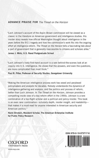The Aspin-Brown Commission of 1995-1996, led by former U.S. Defense Secretaries Les Aspin and Harold Brown, was a landmark inquiry into the activities of America's secret agencies. The purpose of the commission was to help the Central Intelligence Agency and other organizations in the U.S. intelligence community adapt to the quite different world that had emerged after the end of the Cold War in 1991. In The Threat on the Horizon, eminent national security scholar Loch K. Johnson, who served as Aspin's assistant, offers a comprehensive insider's account of this inquiry. Based on a close sifting of government documents and media reports, interviews with participants, and, above all, his own eyewitness impressions, Johnson's thorough history offers a unique window onto why the terrorist attacks of 2001 caught the United States by surprise and why the intelligence community failed again in 2002 when it predicted that Iraq possessed weapons of mass destruction. It will be the first published account by an insider of a presidential commission on intelligence-a companion volume to Johnson's acclaimed study of the Church Committee investigation into intelligence in 1975 (A Season of Inquiry). This examination of the Aspin-Brown Commission is an invaluable source for anyone interested in the how the intelligence agencies of the world's most powerful nation struggled to confront new global threats that followed the collapse of the Soviet empire, and why Washington, D.C. was unprepared for the calamities that would soon arise.