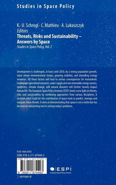 Development is challenged by, at least until 2050, a strong population, more severe environmental strains, growing mobility, and dwindling energy resources. All these factors will lead to serious consequences for humankind. Inadequate agricultural resources, water supply and non renewable energy sources, epidemics, climate change, and natural disasters will further heavily impact human life. The European Space Policy Institute (ESPI) sheds a new light on threats, risks and sustainability by combining approaches from various disciplines. It analyzes what could be the contribution of space tools to predict, manage and mitigate those threats. It aims at demonstrating that space is not a niche but has become an overarching tool in solving today's problems.