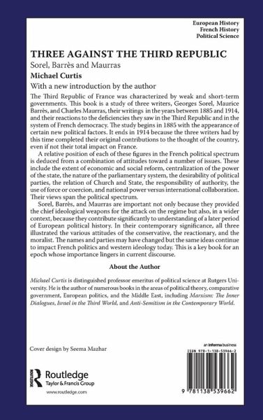 The Third Republic of France was characterized by weak and short-term governments. This book is a study of three writers, Georges Sorel, Maurice Barres, and Charles Maurras, their writings in the years between 1885 and 1914, and their reactions to the deficiencies they saw in the Third Republic and in the system of French democracy.