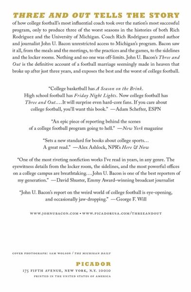 "Like the Moneyball of college football, Three and Out blows the lid off one of the sports world's most perplexing mysteries."-Entertainment Weekly Three and Out tells the story of how college football's most influential coach, Rich Rodriguez, took over the nation's most successful program, only to produce three of the worst seasons in the University of Michigan's celebrated history. Coach Rich Rodriguez granted author and journalist John U. Bacon unrestricted access to the Michigan Wolverines' program. Bacon saw it all, from the meals and the meetings, to the practices and the games, to the sidelines and the locker rooms. Nothing and no one was off-limits. John U. Bacon's Three and Out is the definitive account of a football marriage seemingly made in heaven that broke up after just three years, and exposes the best and the worst of college football.