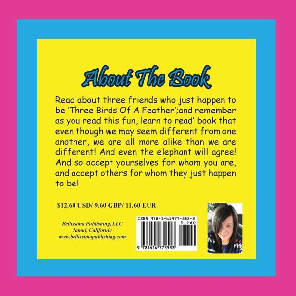 Like the three birds of a feather in this story, we are all basically alike on the inside, even though we look different on the outside. So, there really isn't any reason we can't all love and care for one another, and like these three birds of a feather, all become the very best of friends. Even the elephant will tell you this is true! And just imagine what a wonderful world this would be if we all looked at one another as birds of a feather! Think about this as you practice reading skills and build your reading word vocabulary, using this fun-filled 'learn to read' book written and illustrated by the award winning author, attorney and former teacher, Penelope Dyan! But most of all, have fun as you learn and practice your reading skills as you travel through this fun 'learn to read' book filled with word recognition, word repetition and rhyme! And . . . when you have completed your journey through the pages of this fun-filled 'learn to read' book, you can go to the Bellissimavideo YouTube channel, and you can watch the free, fun music video that goes with this book; and you can have even more learning fun!