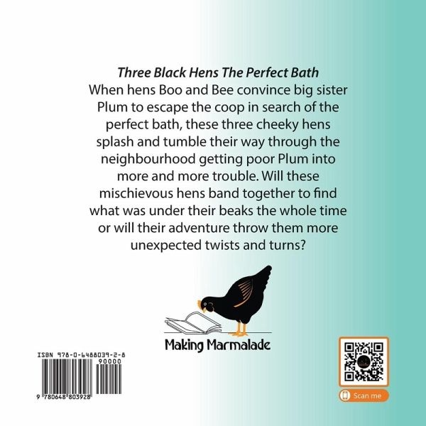 A beautifully illustrated picture book, Plum, Boo and Bee are Three Black Hens with hustle. These three cheeky chickens are in search of something better and plan to fly the coop. Will they find The Perfect Bath? Laugh as the chickens splash and tumble their way through the neighbourhood getting into more and more strife. A delightful story of companionship, The Perfect Bath uses rhyme, poetry, and onomatopoeia to capture your imagination. Discover if the Three Black Hens adventure throws them more twists and turns or whether they find what was under their beaks the whole time. A great little book to form sounds, learn first words, and beginning to read. ¿¿¿¿¿"The Three Black Hens stories are perfectly simple but have a lovely energy. I do love the hens - I find myself thinking about them at odd moments!" Catherine Bateson; Multi award winning Australian author
