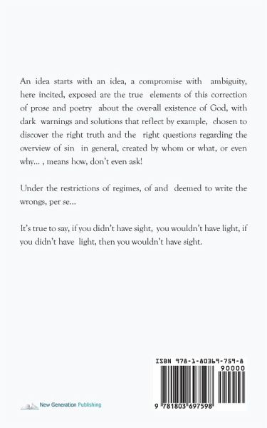An idea starts with an idea, a compromise with ambiguity, here incited, exposed are the true elements of this correction of prose and poetry about the over-all existence of God, with dark warnings and solutions that reflect by example, chosen to discover the right truth and the right questions regarding the overview of sin in general, created by whom or what, or even why... , means how, don't even ask! Under the restrictions of regimes, of and deemed to write the wrongs, per se... It's true to say, if you didn't have sight, you wouldn't have light, if you didn't have light, then you wouldn't have sight.