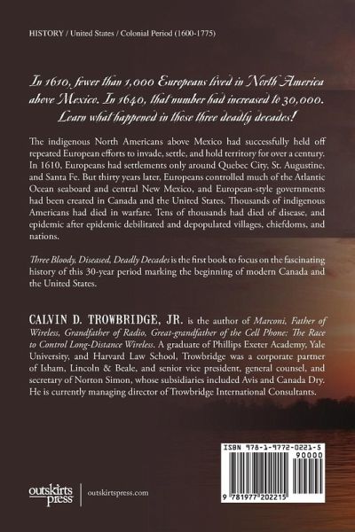 On June 7, 1610, less than one thousand Europeans lived permanently in North America above Mexico. They had outposts only around Quebec City, St. Augustine, and Santa Fe. Yet thirty years later, thirty thousand Europeans lived in the United States and Canada and controlled substantial territory along the east coast and in New Mexico. What happened? Three Bloody, Diseased, Deadly Decades: A History, the Beginning of Modern Canada and the United States, The Struggle between Indigenous Americans and Europeans, What Really Happened, 1610-1640 is the first book devoted to these three decades when indigenous Americans first permanently lost significant land to Europeans and modern Canada and the United States began. It recounts how the European population grew slowly at first, then exponentially; how the Montagnais, Algonkin, and Huron allied with the French against the Mohawk; why Plymouth survived at all; why the Boston Bay Company landed successfully; how the Pequot lost the lower Connecticut River Valley; how the Dutch claimed the tidal Hudson River; why the failure of the Powhatan uprising and John Rolfe's tobacco led to English domination in tidewater Virginia; and how Spanish established hegemony in coastal Georgia, northern Florida, and central New Mexico. Calvin D. Trowbridge, Jr., is the author of two books on North America above Mexico from Columbus in 1492 to 1640 and a biography of Marconi, the inventor of long-distance wireless communication. Three Bloody, Diseased, Deadly Decades will benefit all who are interested in American and Canadian history.