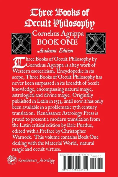 Three Books of Occult Philosophy by Cornelius Agrippa is a key work of Western esotericism. Encyclopedic in its scope, Three Books of Occult Philosophy has never been surpassed in its breadth of occult knowledge, encompassing natural magic, astrological and divine magic. Originally published in Latin in 1533, until now it has only been available in a 17th century translation that remains problematic despite modern attempts to annotate. Renaissance Astrology Press is proud to present the first modern translation from the Latin critical edition by Eric Purdue, edited with a Preface by the noted astrologer and magician Christopher Warnock. This volume contains Book One dealing with the Material World, natural magic and occult virtues. This edition is heavily annotated with over 1,000 footnotes, with all of Agrippa's sources carefully noted. Finally Agrippa's occult masterpiece is available in an accurate modern English translation!