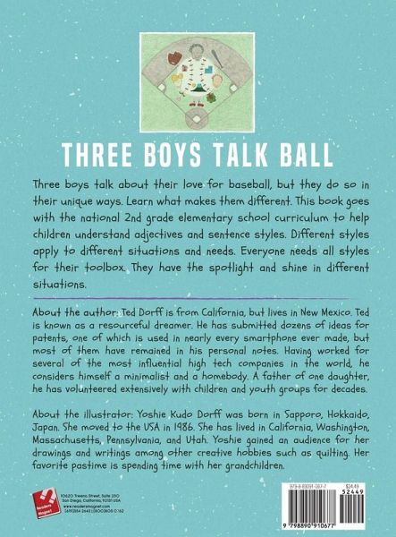 Three boys talk about their love for baseball, but they do so in their unique ways. Learn what makes them different. This book goes with the national 2nd grade elementary school curriculum to help children understand adjectives and sentence styles. Different styles apply to different situations and needs. Everyone needs all styles for their toolbox. They have the spotlight and shine in different situations