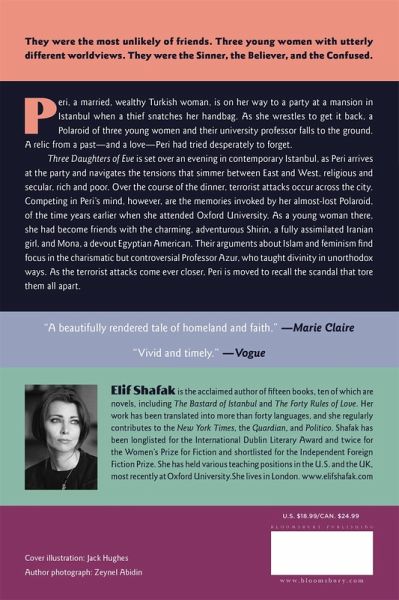 "Rich and complex."--Harper's Bazaar * "Vivid and timely."--Vogue "A beautifully rendered tale of homeland and faith" (Marie Claire), from the acclaimed author of 10 Minutes 38 Seconds in This Strange World, shortlisted for the 2019 Booker Prize, and The Island of Missing Trees, a Reese's Book Club pick. Peri, a married, wealthy, beautiful Turkish woman, is on her way to a dinner party at a seaside mansion in Istanbul when a beggar snatches her handbag. As she wrestles to get it back, a photograph falls to the ground--an old polaroid of three young women and their university professor. A relic from a past--and a love--Peri had tried desperately to forget. Three Daughters of Eve is set over an evening in contemporary Istanbul, as Peri arrives at the party and navigates the tensions that simmer in this crossroads country between East and West, religious and secular, rich and poor. Over the course of the dinner, and amidst an opulence that is surely ill-begotten, terrorist attacks occur across the city. Competing in Peri's mind however are the memories invoked by her almost-lost polaroid, of the time years earlier when she was sent abroad for the first time, to attend Oxford University. As a young woman there, she had become friends with the charming, adventurous Shirin, a fully assimilated Iranian girl, and Mona, a devout Egyptian-American. Their arguments about Islam and feminism find focus in the charismatic but controversial Professor Azur, who teaches divinity, but in unorthodox ways. As the terrorist attacks come ever closer, Peri is moved to recall the scandal that tore them all apart. Elif Shafak is the number one bestselling novelist in her native Turkey, and her work is translated and celebrated around the world. In Three Daughters of Eve, she has given us a rich and moving story that humanizes and personalizes one of the most profound sea changes of the modern world.
