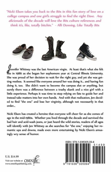 Jennifer Whitney was the last American virgin. At least that's what she felt like in 1986 as she began her sophomore year at Central Illinois University. She was proud of her decision to wait for the right guy, and yet she was getting restless. It seemed like everyone around her was doing it... and having fun doing it, too. She didn't want to become the campus slut or anything, but surely there was a difference between a trashy skank and a nice girl with a little experience. Perhaps it was time to stop relying on fate to guide her and instead take matters into her own hands. And with that realization, Jen decided to find "the one"? and lose her virginity, although not necessarily in that order... Nicki Elson has created a heroine that everyone will cheer for as she comes of age in the mid-1980s. Whether you lived through the decade and survived the bad hair and acid-wash jeans, or just heard the wild stories, readers of all ages will identify with Jen Whitney as she searches for "the one,?" enjoying her romantic ups and downs, made even more entertaining by Nicki Elson's amusingly wry sense of humor.