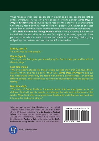 Lyle Lee Jenkins is the author of over 30 books ranging from school improvement, math education, and early reader books. A former school superintendent and educator, he is passionate about equipping educators and parents with practical tools that excite children about learning and reading. Lyle Lee lives in Scottsdale, Arizona and enjoys traveling, speaking as an educational consultant, and engaging in a vibrant church community. Jim Chansler is a retired public-school educator who lives in Yuba City, California. Jim taught art and music prior to retirement. He has illustrated many of the books in this series. Adrienne Gain is the editor for the Bible Patterns for Young Readers series. She specializes in early childhood development and lives in Arizona with her husband and two daughters. For more information or to contact Dr. Jenkins, visit www.LyleLeeJenkins.com.