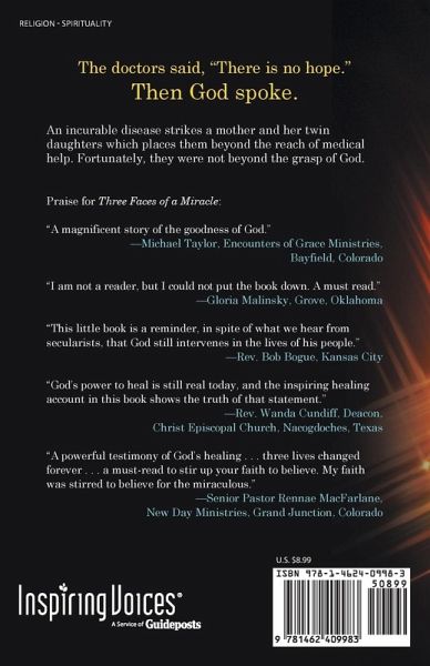 The doctors said, "There is no hope." Then God spoke. An incurable disease strikes a mother and her twin daughters which places them beyond the reach of medical help. Fortunately, they were not beyond the grasp of God. Praise for Three Faces of a Miracle: "A magnificent story of the goodness of God." -Michael Taylor, Encounters of Grace Ministries, Bayfield, Colorado "I am not a reader, but I could not put the book down. A must read." -Gloria Malinsky, Grove, Oklahoma "This little book is a reminder, in spite of what we hear from secularists, that God still intervenes in the lives of his people." -Rev. Bob Bogue, Kansas City "God's power to heal is still real today, and the inspiring healing account in this book shows the truth of that statement." -Rev. Wanda Cundiff, Deacon, Christ Episcopal Church, Nacogdoches, Texas "A powerful testimony of God's healing . . . three lives changed forever . . . a must-read to stir up your faith to believe. My faith was stirred to believe for the miraculous." -Senior Pastor Rennae MacFarlane, New Day Ministries, Grand Junction, Colorado