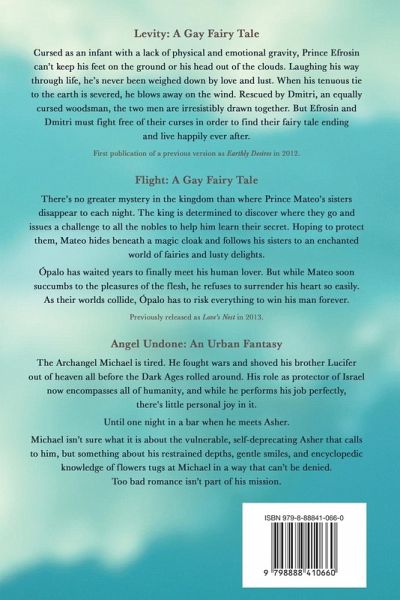 Three of Leta Blake's most popular and naughty fantasy stories! Now bundled together at a discounted price! Levity: A Gay Fairy Tale Cursed as an infant with a lack of physical and emotional gravity, Prince Efrosin can't keep his feet on the ground or his head out of the clouds. Laughing his way through life, he's never been weighed down by love and lust. When his tenuous tie to the earth is severed, he blows away on the wind. Rescued by Dmitri, an equally cursed woodsman, the two men are irresistibly drawn together. But Efrosin and Dmitri must fight free of their curses in order to find their fairy tale ending and live happily ever after. First publication of a previous version as Earthly Desires by Ellora's Cave in 2012. Flight: A Gay Fairy Tale There's no greater mystery in the kingdom than where Prince Mateo's sisters disappear to each night. The king is determined to discover where they go and issues a challenge to all the nobles to help him learn their secret. Hoping to protect them, Mateo hides beneath a magic cloak and follows his sisters to an enchanted world of fairies and lusty delights. Ópalo has waited years to finally meet his human lover. But while Mateo soon succumbs to the pleasures of the flesh, he refuses to surrender his heart so easily. As their worlds collide, Ópalo has to risk everything to win his man forever. Previously released as Love's Nest by Ellora's Cave in 2013. Angel Undone: An Urban Fantasy The Archangel Michael is tired. He fought wars and shoved his brother Lucifer out of heaven all before the Dark Ages rolled around. His role as protector of Israel now encompasses all of humanity, and while he performs his job perfectly, there's little personal joy in it. Until one night in a bar when he meets Asher. Michael isn't sure what it is about the vulnerable, self-deprecating Asher that calls to him, but something about his restrained depths, gentle smiles, and encyclopedic knowledge of flowers tugs at Michael in a way that can't be denied. Too bad romance isn't part of his mission.