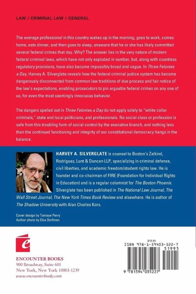 The average professional in this country wakes up in the morning, goes to work, comes home, eats dinner, and then goes to sleep, unaware that he or she has likely committed several federal crimes that day. Why? The answer lies in the very nature of modern federal criminal laws, which have exploded in number but also become impossibly broad and vague. In Three Felonies a Day, Harvey A. Silverglate reveals how federal criminal laws have become dangerously disconnected from the English common law tradition and how prosecutors can pin arguable federal crimes on any one of us, for even the most seemingly innocuous behavior. The volume of federal crimes in recent decades has increased well beyond the statute books and into the morass of the Code of Federal Regulations, handing federal prosecutors an additional trove of vague and exceedingly complex and technical prohibitions to stick on their hapless targets. The dangers spelled out in Three Felonies a Day do not apply solely to "white collar criminals," state and local politicians, and professionals. No social class or profession is safe from this troubling form of social control by the executive branch, and nothing less than the integrity of our constitutional democracy hangs in the balance.