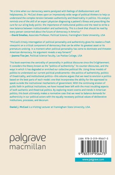 This book examines the centrality of personality in political discourse since the Enlightenment. It considers the theory known as the "politics of authenticity," its counter-discourses, and the ways in which it has degraded or enriched our collective political life. Using three models of politics to understand our current political predicaments-the politics of authenticity, politics of theatricality, and institutional politics-this volume argues that we need to envision a politics based on the best parts of each model: one that incorporates the ability for the oppressed to speak outside the institutional mechanisms of government. With the continuing erosion of public faith in political institutions, we have instead been left with the most troubling aspects of both authentic and theatrical politics. By exploring recent events and trends in American politics, this book ultimately makes a normative case that we need to balance demands for authenticity in our political actors with the equally necessary political values of deliberative institutions, processes, and decorum.