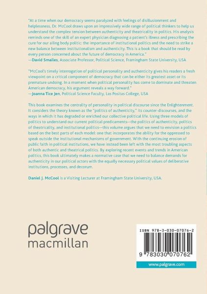 This book examines the centrality of personality in political discourse since the Enlightenment. It considers the theory known as the "politics of authenticity," its counter-discourses, and the ways in which it has degraded or enriched our collective political life. Using three models of politics to understand our current political predicaments-the politics of authenticity, politics of theatricality, and institutional politics-this volume argues that we need to envision a politics based on the best parts of each model: one that incorporates the ability for the oppressed to speak outside the institutional mechanisms of government. With the continuing erosion of public faith in political institutions, we have instead been left with the most troubling aspects of both authentic and theatrical politics. By exploring recent events and trends in American politics, this book ultimately makes a normative case that we need to balance demands for authenticity in our political actors with the equally necessary political values of deliberative institutions, processes, and decorum.