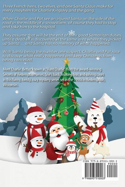 Three French hens, two elves, and one Santa Claus make for merry mayhem for Charlie Kingsley and the gang. When Charlie and Pat see an injured Santa on the side of the road in the middle of a snowstorm, of course they had to stop and take him to the hospital. They assumed that would be the end of their good Samaritan duties, until a dead elf is discovered in the same area where they picked up Santa ... and Santa has no memory of what happened. With Santa being the number one suspect, Charlie and Pat race to discover what really happened and keep Christmas from being cancelled. Meet Charlie. Better known as "Aunt Charlie" from the award-winning Secrets of Redemption series. She's back, making teas and solving cases in this funny, twisty, cozy mystery series set in the 1990s in Redemption, Wisconsin.
