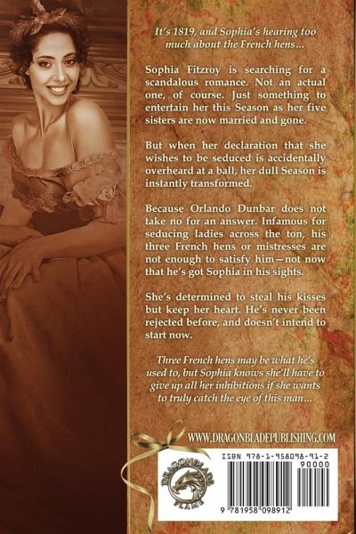 It's 1819, and Sophia's hearing too much about the French hens... Sophia Fitzroy is searching for a scandalous romance. Not an actual one, of course. Just something to entertain her this Season as her five sisters are now married and gone. But when her declaration that she wishes to be seduced is accidentally overheard at a ball, her dull Season is instantly transformed. Because Orlando Dunbar does not take no for an answer. Infamous for seducing ladies across the ton, his three French hens or mistresses are not enough to satisfy him-not now that he's got Sophia in his sights. She's determined to steal his kisses but keep her heart. He's never been rejected before, and doesn't intend to start now. Three French hens may be what he's used to, but Sophia knows she'll have to give up all her inhibitions if she wants to truly catch the eye of this man... This novella is a steamy Regency romance with a happily ever after, no cliffhangers, and is part of a series which can be read in any order - but follow the numbers down for the best reading experience! Note: This series is part of Dragonblade's Flame line, so this is a sexy, steamy, and scorching-hot read with multiple sex scenes. Be advised. The Twelve Days of Christmas Book 1 - Twelve Drummers Drumming Book 2 - Eleven Pipers Piping Book 3 - Ten Lords a Leaping Book 4 - Nine Ladies Dancing Book 5 - Eight Maids a Milking Book 6 - Seven Swans a Swimming Book 7 - Six Geese a Laying Book 8 - Five Gold Rings Book 9 - Four Calling Birds Book 10 - Three French Hens Book 11 - Two Turtle Doves Book 12 - A Partridge in a Pear Tree