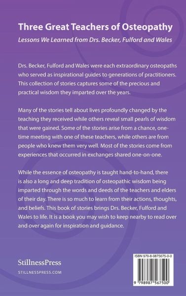 Drs. Becker, Fulford and Wales were each extraordinary osteopaths who served as inspirational guides to generations of practitioners. This collection of stories captures some of the precious and practical wisdom they imparted over the years. Many of the stories tell about lives profoundly changed by the teaching they received while others reveal small pearls of wisdom that were gained. Some of the stories arise from a chance, one-time meeting with one of these teachers, while others are from people who knew them very well. Most of the stories come from experiences that occurred in exchanges shared one-on-one. While the essence of osteopathy is taught hand-to-hand, there is also a long and deep tradition of osteopathic wisdom being imparted through the words and deeds of the teachers and elders of their day. There is so much to learn from their actions, thoughts, and beliefs. ¿ This book of stories brings Drs. Becker, Fulford and Wales to life. It is a book you will wish to keep nearby to read over and over again for inspiration and guidance.