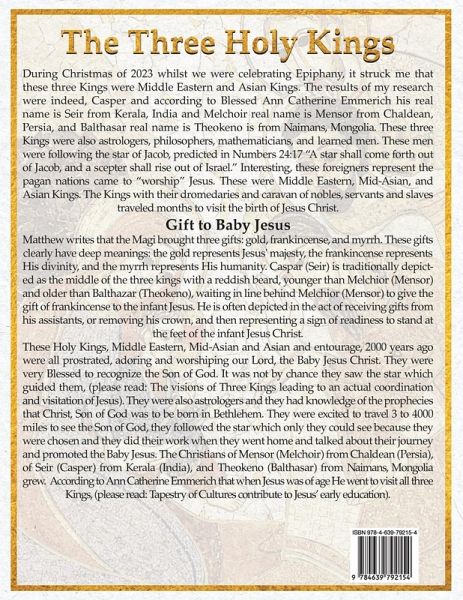 During Christmas of 2023 whilst we were celebrating Epiphany, it struck me that these three Kings were Middle Eastern and Asian Kings. The results of my research were indeed, Casper and according to Blessed Ann Catherine Emmerich his real name is Seir from Kerala, India and Melchoir real name is Mensor from Chaldean, Persia, and Balthasar real name is Theokeno is from Naimans, Mongolia. These three Kings were also astrologers, philosophers, mathematicians, and learned men. These men were following the star of Jacob, predicted in Numbers 24:17 "A star shall come forth out of Jacob, and a…mehr