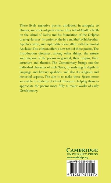 These lively narrative poems, attributed in antiquity to Homer, are works of great charm. Composed for recitation at festivals in honour of the gods, they tell of Apollo's birth on the island of Delos and his foundation of the Delphic oracle; Hermes' invention of the lyre and theft of his brother Apollo's cattle; and Aphrodite's love affair with the mortal Anchises. This edition offers a new text of these poems. The Introduction discusses among other things the nature and purpose of the poems in general, their origins, their structure and themes. The Commentary brings out the individual character of each Hymn, by analyzing in depth its language and literary qualities, and also its religious and historical aspects. The aim is to make these Hymns more accessible to students of Greek literature, and help them to appreciate the poems more fully as major works of early Greek poetry.