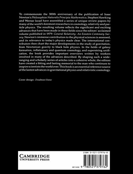 Preface 1. Newton's Principia S. W. Hawking 2. Newtonianism and today's physics S. Weinberg 3. Newton, quantum theory and reality R. Penrose 4. Experiments on gravitation A. H. Cook 5. Experimental gravitation from Newton's Principia to Einstein's general relativity C. M. Will 6. The problem of motion in Newtonian and Einsteinian gravity T. Damour 7. Dark stars: the evolution of an idea W. Israel 8. Astrophysical black holes R. D. Blandford 9. Gravitational radiation K. S. Thorne 10. The emergence of structure in the universe: galaxy formation and dark matter M. J. Rees 11. Gravitational interactions of cosmic strings A. Vilenkin 12. Inflationary cosmology S. K. Blau and A. H. Guth 13. Inflation and quantum cosmology A. Linde 14. Quantum cosmology S. W. Hawking 15. Superstring unification J. H. Schwartz 16. Covariant description of canonical formalism in geometrical theories C. Crnkowic and E. Witten Index.