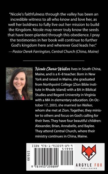 Nicole Cherie Walker lives in South China, Maine, and is a K-8 teacher. Born in New York and raised in Maine, she graduated from Northpoint College (Zion Bible Institute in Rhode Island) with a BA in Biblical Studies and Regent University in Virginia with a MA in elementary education. On October 17, 2003, she married Ian Walker, whom she met at Zion. Together, they minister to others and focus on God's calling for their lives. They have four beautiful children: Alexander, Brian, Annabelle, and Baylee. They attend Central Church, where their ministry continues in China, Maine.