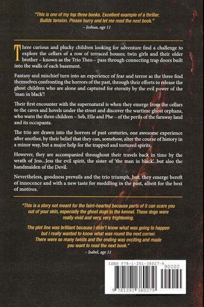 Three curious and plucky children looking for adventure find a challenge to explore the underground cellars of a row of terraced houses. Fantasy and mischief turn into an experience of fear and terror as the three find themselves confronting the horrors of the past, through their efforts to release the ghost children who are alone and captured for eternity by the evil power of the 'man in black'! The trio are drawn into the horrors of past centuries, one awesome experience after another, by their belief that they can, somehow, alter the course of history in a minor way, but a major help for the trapped and tortured spirits. However, they are accompanied throughout their travels back in time by the wrath of Jess...Jess the evil spirit, the sister of 'the man in black'....but also the handmaiden of the Devil. Nevertheless, goodness prevails and the trio triumph, but, they emerge bereft of innocence and with a new taste for meddling in the past, albeit for the best of motives.