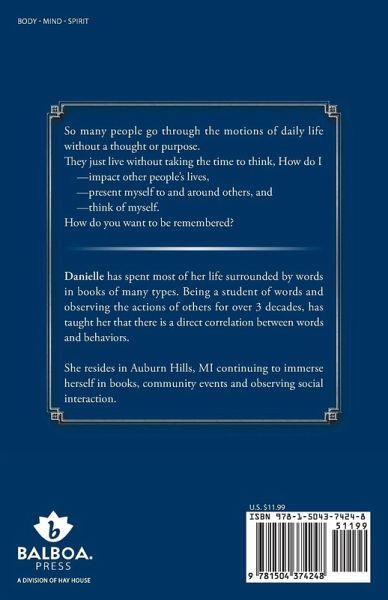 So many people go through the motions of daily life without a thought or purpose. They just live without taking the time to think, How do I —impact other people’s lives, —present myself to and around others, and —think of myself. How do you want to be remembered?