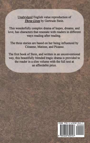 Unabridged English value reproduction of Three Lives by Gertrude Stein. This wonderfully complex drama of hopes, dreams, and love, has characters that resonate with readers in different ways reading after reading. The three stories are based on her being influenced by Cézanne, Matisse, and Picasso. The first book of Stein, and written in an unconventional way, this beautifully blended tragic drama is provided to the reader in a slim volume with the full text at an affordable price. Contents THE GOOD ANNA 3 MELANCTHA 32 THE GENTLE LENA 90