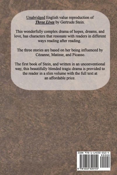 Unabridged English value reproduction of Three Lives by Gertrude Stein. This wonderfully complex drama of hopes, dreams, and love, has characters that resonate with readers in different ways reading after reading. The three stories are based on her being influenced by Cézanne, Matisse, and Picasso. The first book of Stein, and written in an unconventional way, this beautifully blended tragic drama is provided to the reader in a slim volume with the full text at an affordable price. Contents THE GOOD ANNA 3 MELANCTHA 32 THE GENTLE LENA 90