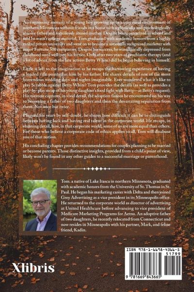 An engrossing memoir of a young boy growing up in a very rural environment of northern Minnesota without friends in a home with a physically and psychologically abusive father and mercilessly abused mother. Despite being ostracized in school and told he wasn't college material, Tom graduated with academic honors from a highly ranked private university and went on to become a nationally recognized marketer with major Fortune 500 companies. Despite his success, he was clinically depressed from childhood until well into his forties. Only after two years of psychiatric therapy (and a lot of advice from the late actress Betty White) did he begin believing in himself. Little is left to the imagination as he recaps the harrowing experience of having a loaded rifle pointed at him by his father. He shares details of one of the most horrendous wedding days and nights imaginable. Ever wondered what it's like to play Scrabble against Betty White? Tom provides the details (as well as provides a play-by-play recap of his young daughter's food fight with Betty-at Betty's request). His memoir captures, in vivid detail, the adoption fiascos he encountered on his way to becoming a father of two daughters and then the devastating separation from them. Not once but twice. Plagued for years by self-doubt, he shares how difficult it can be to distinguish between having luck and having real talent in the corporate world. He recaps, in stunning detail, how, in that corporate world, some of us are more equal than others. For those who believe a corporate code of ethics applies to all, Tom will disabuse you of that notion. His concluding chapter provides recommendations for couples planning to be married or become parents. Those distinctive insights, provided from a child's point of view, likely won't be found in any other guides to a successful marriage or parenthood.