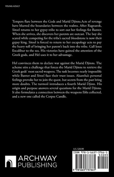 Tempers flare between the Gods and Marid Djinns.Acts of revenge have blurred the boundaries between the realms. After Ragnarok, Sitoel returns to her gypsy tribe to sort out her feelings for Banter. When she arrives, she discovers her parents are outcast. The boy she scared while competing for the tribe's sacred bloodstone is now their gypsy king. Sitoel is forced to return to her escapology acts to pay the heavy toll of bringing her parent's back into the tribe. Gall loses Excalibur to the sea. His victories have gained the attention of the Greek gods, and Hel uses it to her advantage. Hel convinces them to declare war against the Marid Djinns. The scheme stirs a challenge that forces the Marid Djinns to retrieve the Greek gods' most sacred weapons. The task becomes nearly impossible while Banter and Sitoel face their trust issues. Akantha's personal feelings provoke her to join the quest, but secrets from the past bring more doubts. The turmoil introduces a fourth Marid Djinn. His origin and purpose answers several questions for the Marid Djinns. It also formulates a connection between the weapons Iblis collected, and a new one called the Corpse Candle.