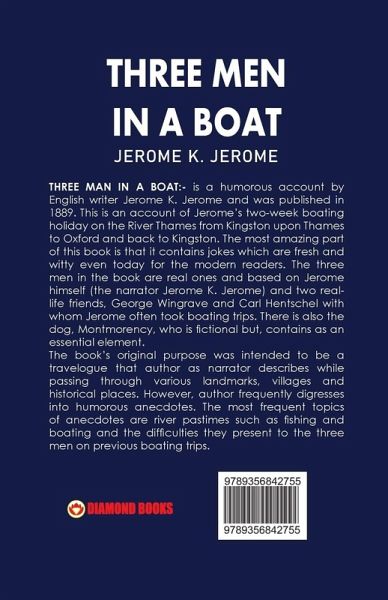 THREE MAN IN A BOAT:- is a humorous account by English writer Jerome K. Jerome and was published in 1889. This is an account of Jerome?s two-week boating holiday on the River Thames from Kingston upon Thames to Oxford and back to Kingston. The most amazing part of this book is that it contains jokes which are fresh and witty even today for the modern readers. The three men in the book are real ones and based on Jerome himself (the narrator Jerome K. Jerome) and two real-life friends, George Wingrave and Carl Hentschel with whom Jerome often took boating trips. There is also the dog, Montmorency, who is fictional but, contains as an essential element. The book?s original purpose was intended to be a travelogue that author as narrator describes while passing through various landmarks, villages and historical places. However, author frequently digresses into humorous anecdotes. The most frequent topics of anecdotes are river pastimes such as fishing and boating and the difficulties they present to the three men on previous boating trips.